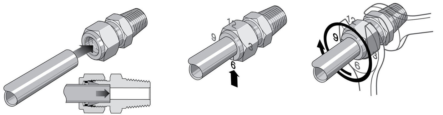 3、 對于Φ1/16、Φ1/8、Φ3/16、Φ2、Φ3、Φ4mm的卡套式管接頭,僅將螺母緊固四分之三圈,使其停在3點(diǎn)鐘方向的位置。